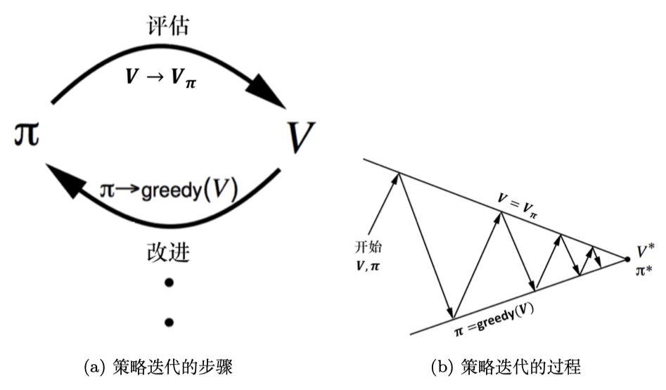 如图 3 所示,(a)描述了上面所说的策略评估和改进持续迭代的过程,(b)则描述了在交替迭代过程中策略