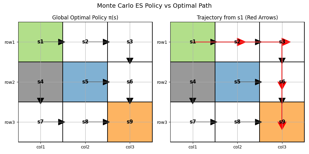 左图展示了不同状态下的全局最优策略,右图用红色箭头高亮显示了从起始状态