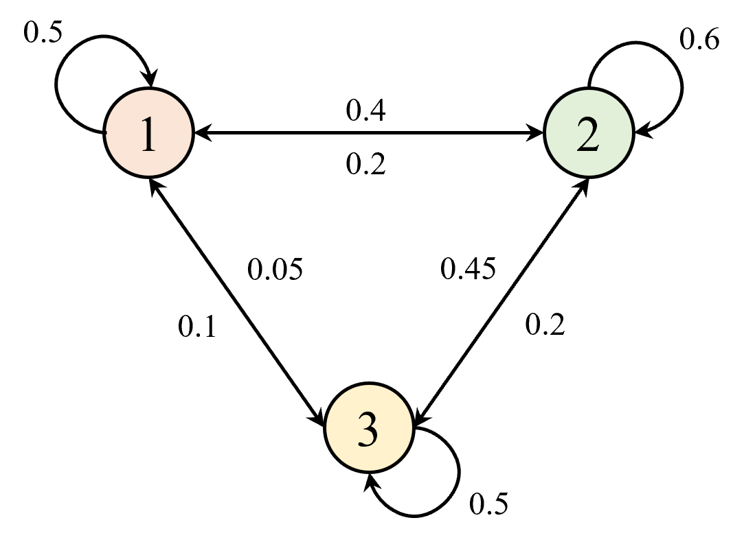 在引入平稳分布概念之前,先来看一个例子。假设有一个简单的马尔可夫过程,包含三个状态