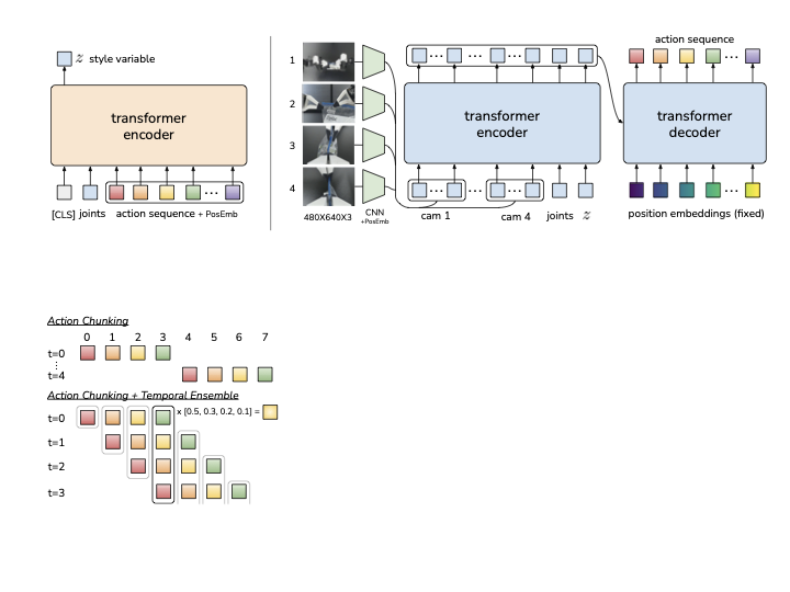 ALOHA(系统层):以较低成本实现 50Hz 双臂遥操作、4 机位观测和高质量精细示教采集。ACT(算法层):为这些高频、长时序、人类示教数据设计更合适的 imitation learning 结构。
