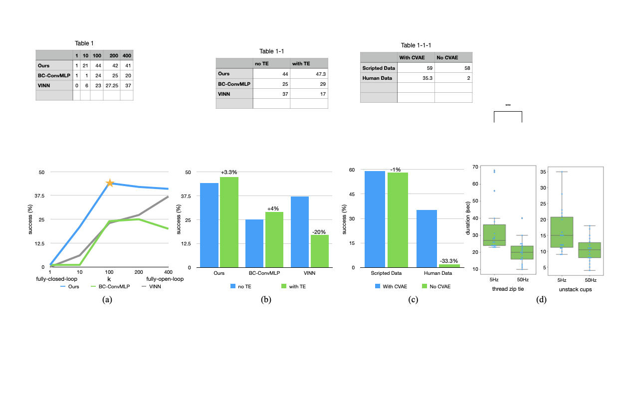 chunk size:从到 ,平均成功率从 1% 提升到 44%,继续增大到接近开环时略有回落。 temporal ensembling:在 ACT 上约 +3.3%。CVAE:脚本数据影响小;人类示教数据从 35.3% 降到 2%(去掉 CVAE)。- 高频用户研究:50Hz 对比 5Hz,5Hz 条件下完成时间约增加 62%,统计显著性
