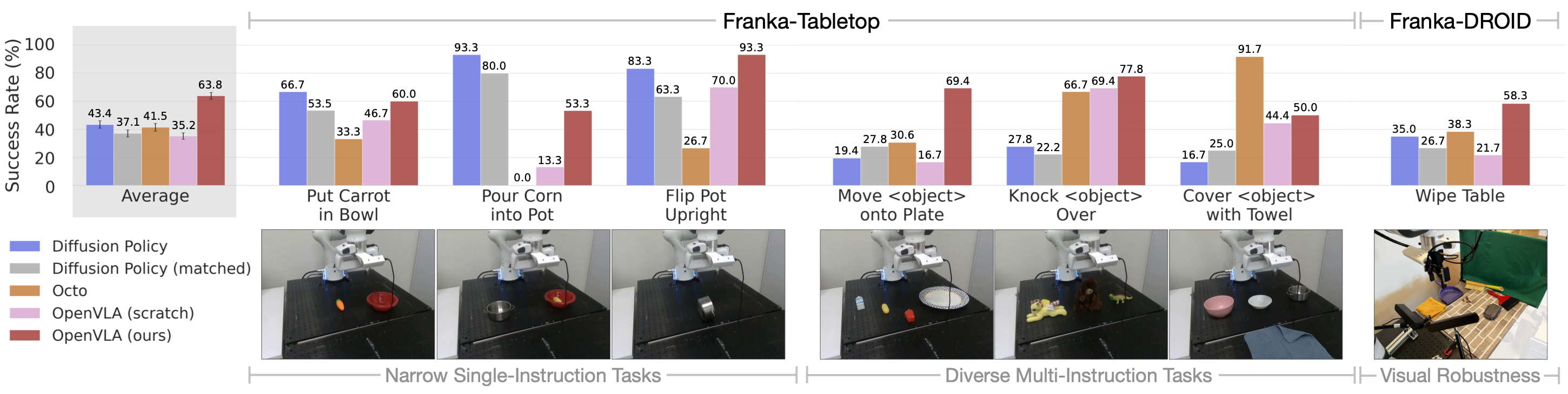 Franka-Tabletop上,OpenVLA平均67.2 ± 4.0%,显著高于Diffusion Policy的48.5 ± 4.9%。 - 在