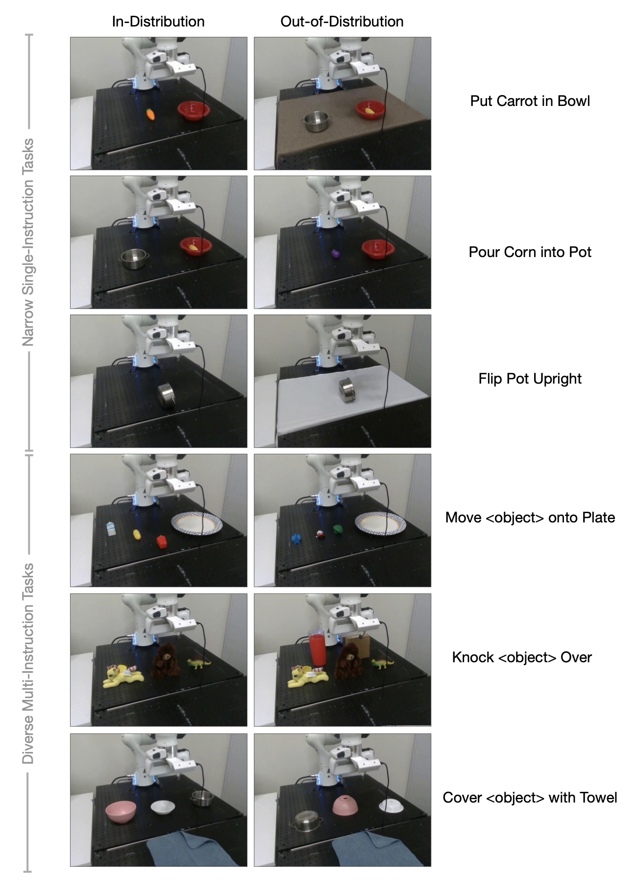 Put Eggplant into Pot (w/ Clutter)这类 visual generalization 任务,会在机器人朝正确目标靠近时给0.5分。Lift Eggplant这类 motion generalization 任务,在只是接触到目标但未完成抓取时也可能给0.5分。- language grounding 任务会固定初始状态,只改变 prompt,看模型是否真的能找对目标。