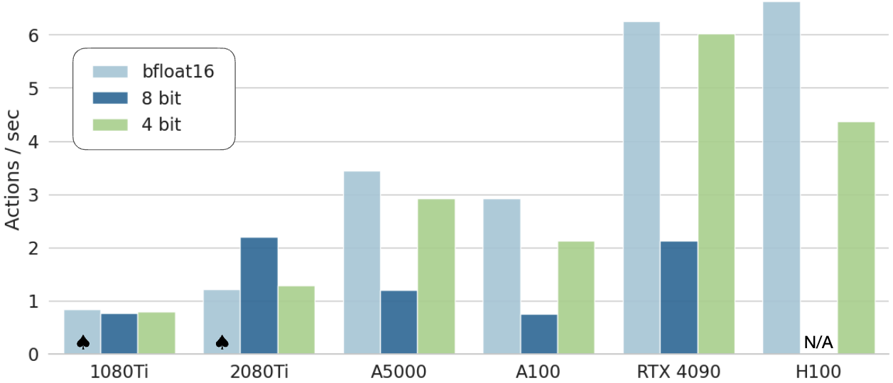 因此,int8 的性能下降并不主要来自“模型变笨了”,而是来自“系统闭环频率偏离了训练时动力学”。作者在附录里又做了一组 blocking-control 复核:当不同精度都被强制放慢到相近节奏时,bfloat16 / int8 / int4 的平均成功率变成 70.0 / 74.4 / 68.8,误差条互相重叠,支持了“速度失配才是主因”这个解释。