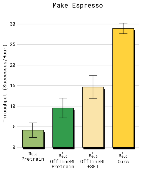论文评测任务覆盖 laundry、espresso、box assembly,单任务时长通常在 5-15 分钟区间。核心指标: