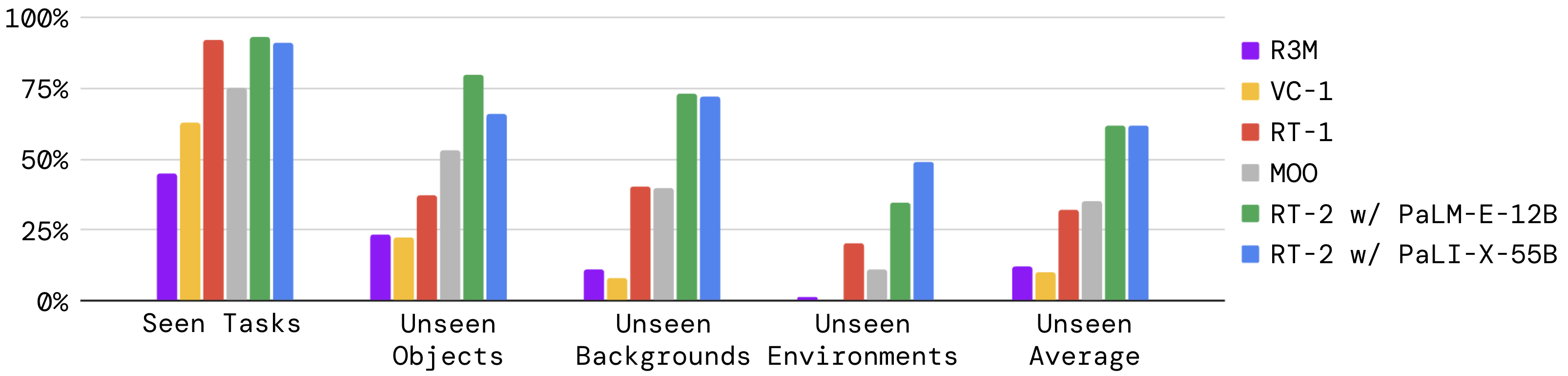 这张图主要说明收益集中在 unseen 维度,而不是所有维度平均上涨。这也正好对应 RT-2 的定位:语义迁移优先。