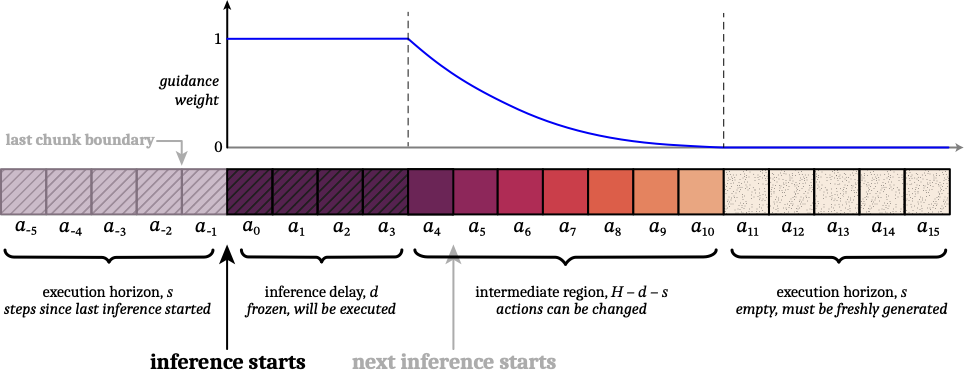 :这些动作在推理完成前一定会被执行,必须强对齐 :有重叠但不一定执行,允许“受约束地修正” :无重叠,完全由新观测主导生成