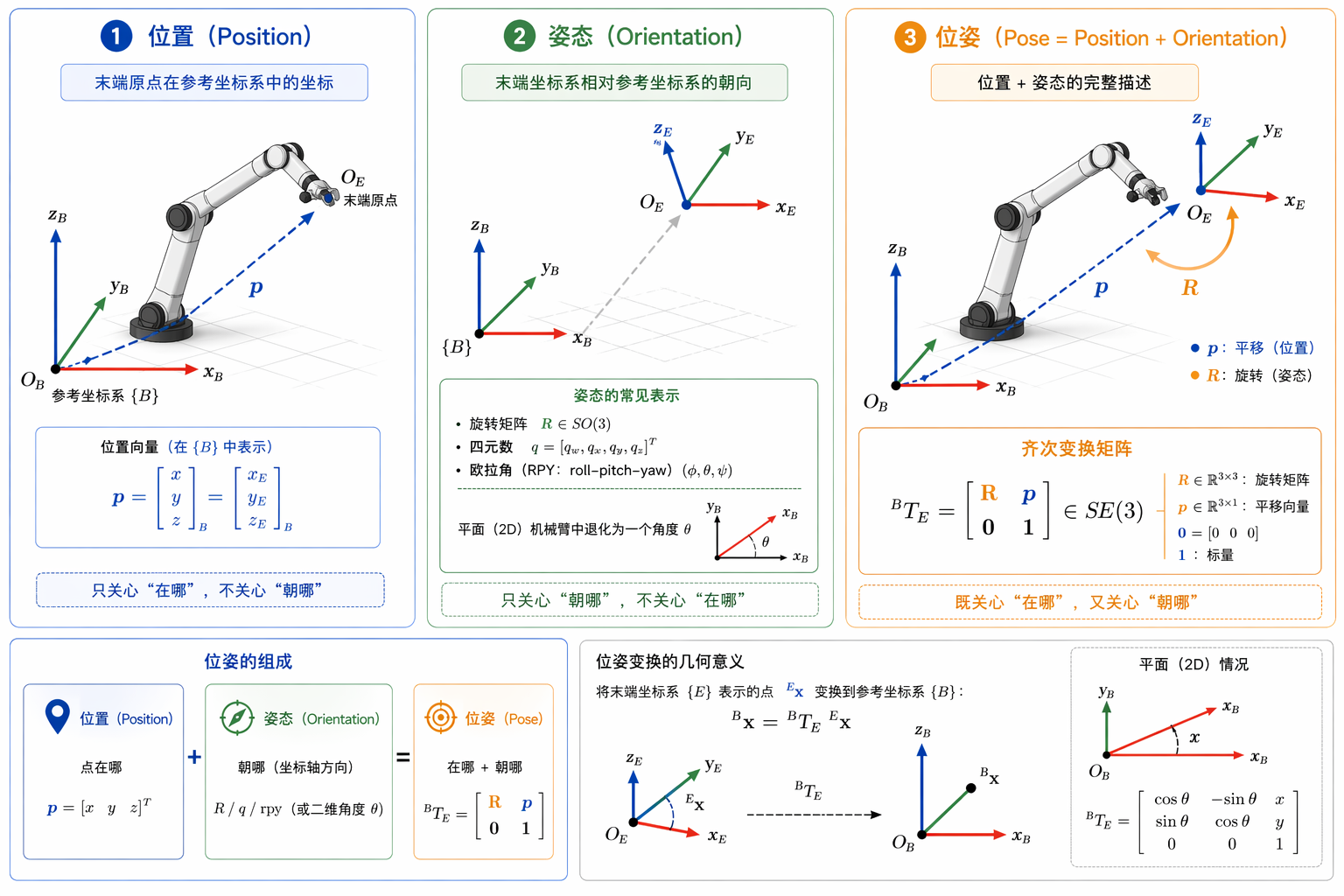- 位置(position):只回答"末端原点在哪"。图左侧蓝色虚线向量
