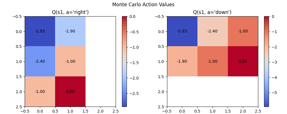 print(f"State {s}: Q(s, 'right') = {q_right[r,c]:.2f}, Q(s, 'down') = {q_down[r,c]:.2f}")