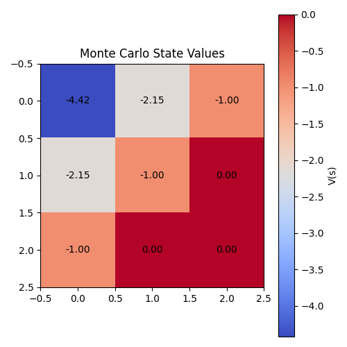 执行代码后,除了打印出各状态的价值函数结果外,还会生成一个热力图来直观展示各状态的价值分布情况,如图 4 所示。
