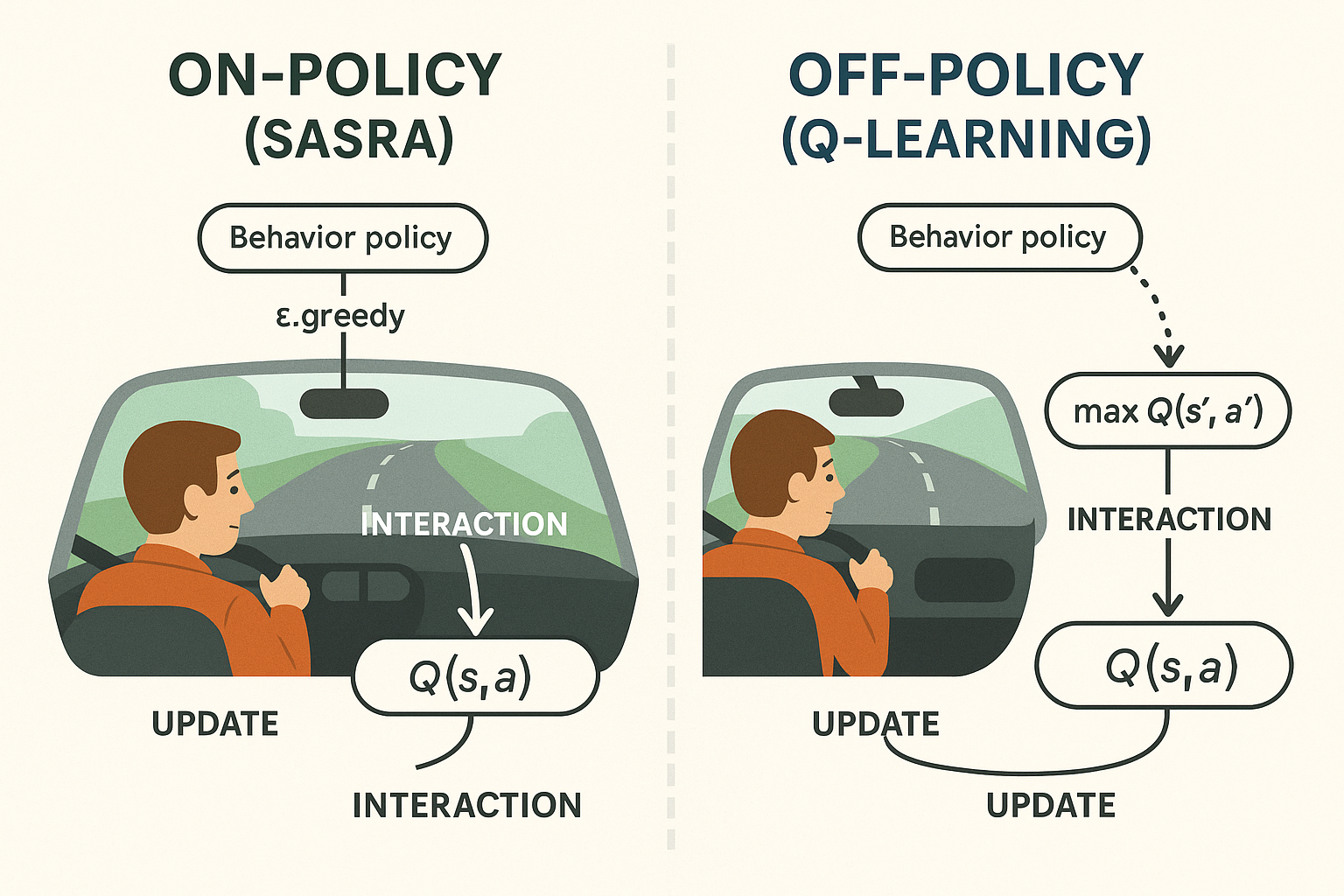 以学习开车为例,如图 4 所示,同策略中,驾驶者按照当前学到的驾驶技巧进行驾驶,同时也在学习和改进这些技巧;而在异策略中,驾驶者心里一直想着最优的驾驶方式,但实际驾驶时可能会因为交通状况、路况等因素而采取不同的驾驶策略。换句话说,同策略就是在"学自己",而异策略则是在"看别人学或学理想中的自己"。