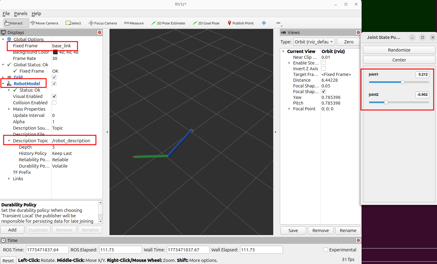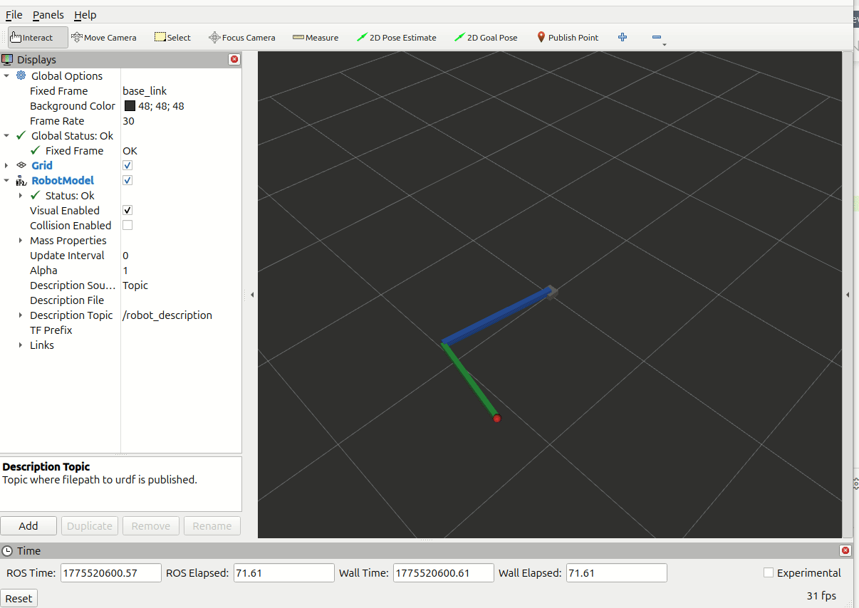 完成后 3D 视口里就能看到机械臂模型。如果模型不动,检查终端 2 的 kinematics_publisher 是否正在运行,以及终端 1 的 robot_state_publisher 日志里有没有报错。
