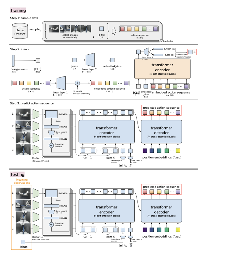 ALOHA(系统层):以较低成本实现 50Hz 双臂遥操作、4 机位观测和高质量精细示教采集。ACT(算法层):为这些高频、长时序、人类示教数据设计更合适的 imitation learning 结构。
