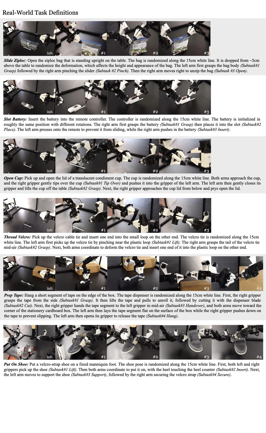 - 真实任务共 6 个,示教多数任务 50 条,Thread Velcro 为 100 条。