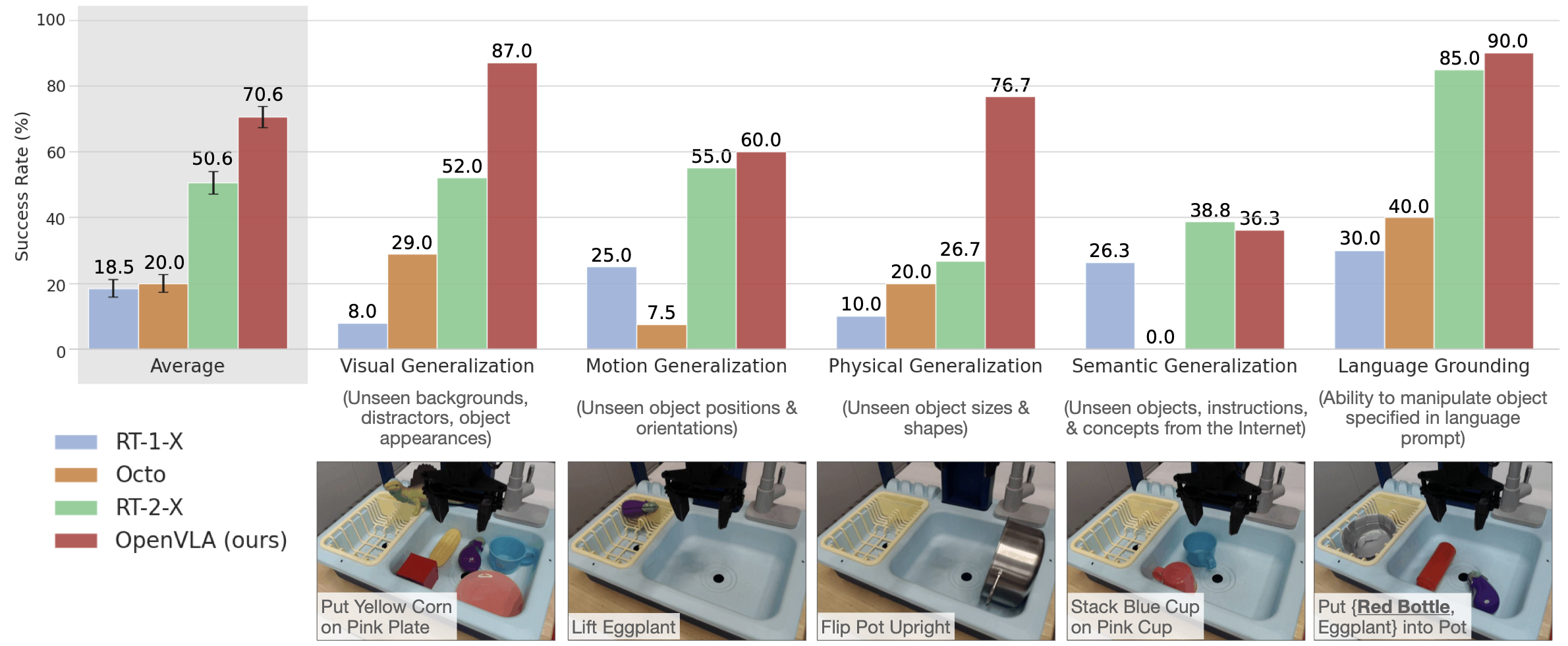 RT-1-X:18.5 ± 2.7%Octo:20.0 ± 2.6%RT-2-X:50.6 ± 3.5%OpenVLA:70.6 ± 3.2%