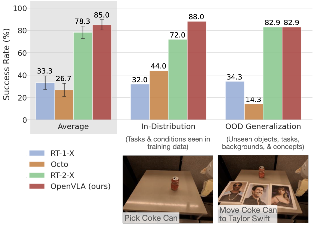 RT-1-X:33.3 ± 6.1%Octo:26.7 ± 5.8%RT-2-X:78.3 ± 5.4%OpenVLA:85.0 ± 4.6%