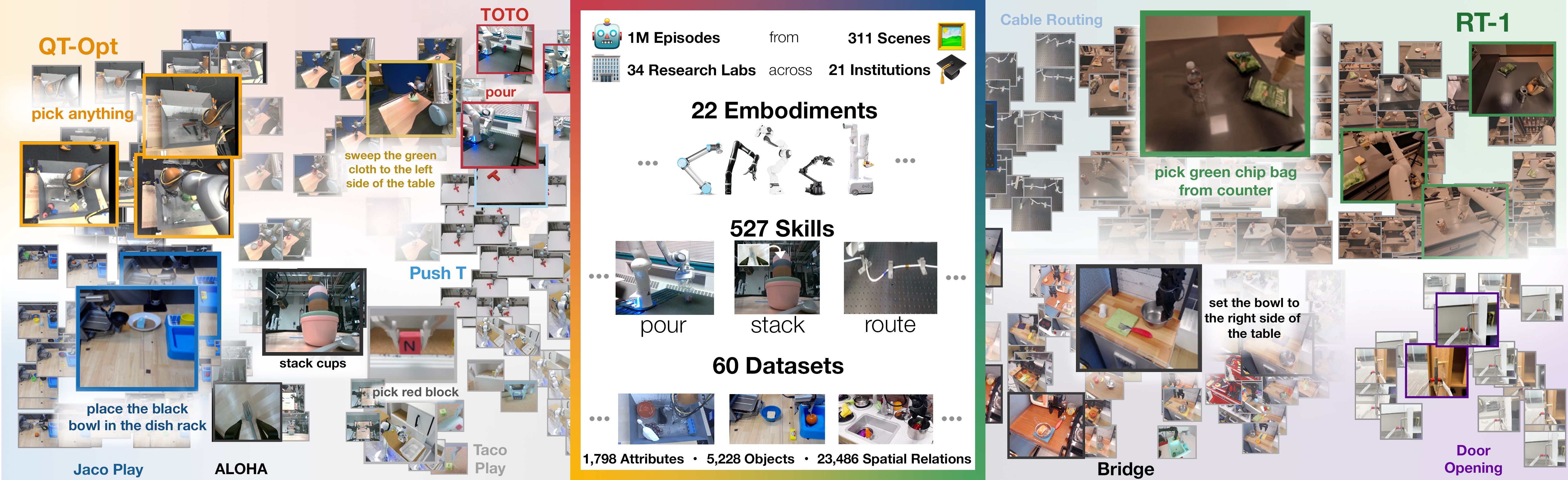 1M+条真实机器人轨迹。22种 robot embodiments。60个已有子数据集。21个机构参与协作,底层数据来自34个研究实验室。- 覆盖