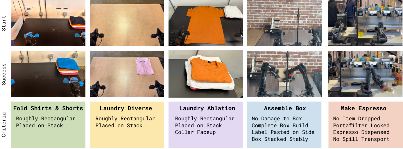 论文评测任务覆盖 laundry、espresso、box assembly,单任务时长通常在 5-15 分钟区间。核心指标: