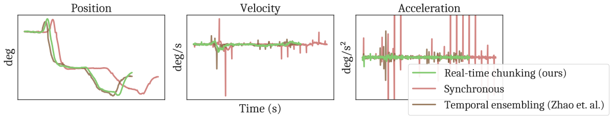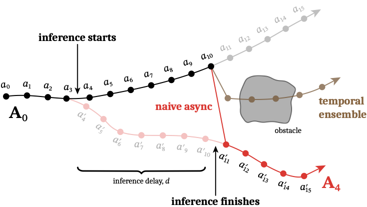 - 与 Temporal Ensembling 等后处理相比,RTC 直接把“下一段生成”写成受约束的条件生成,通常更容易保持策略一致性